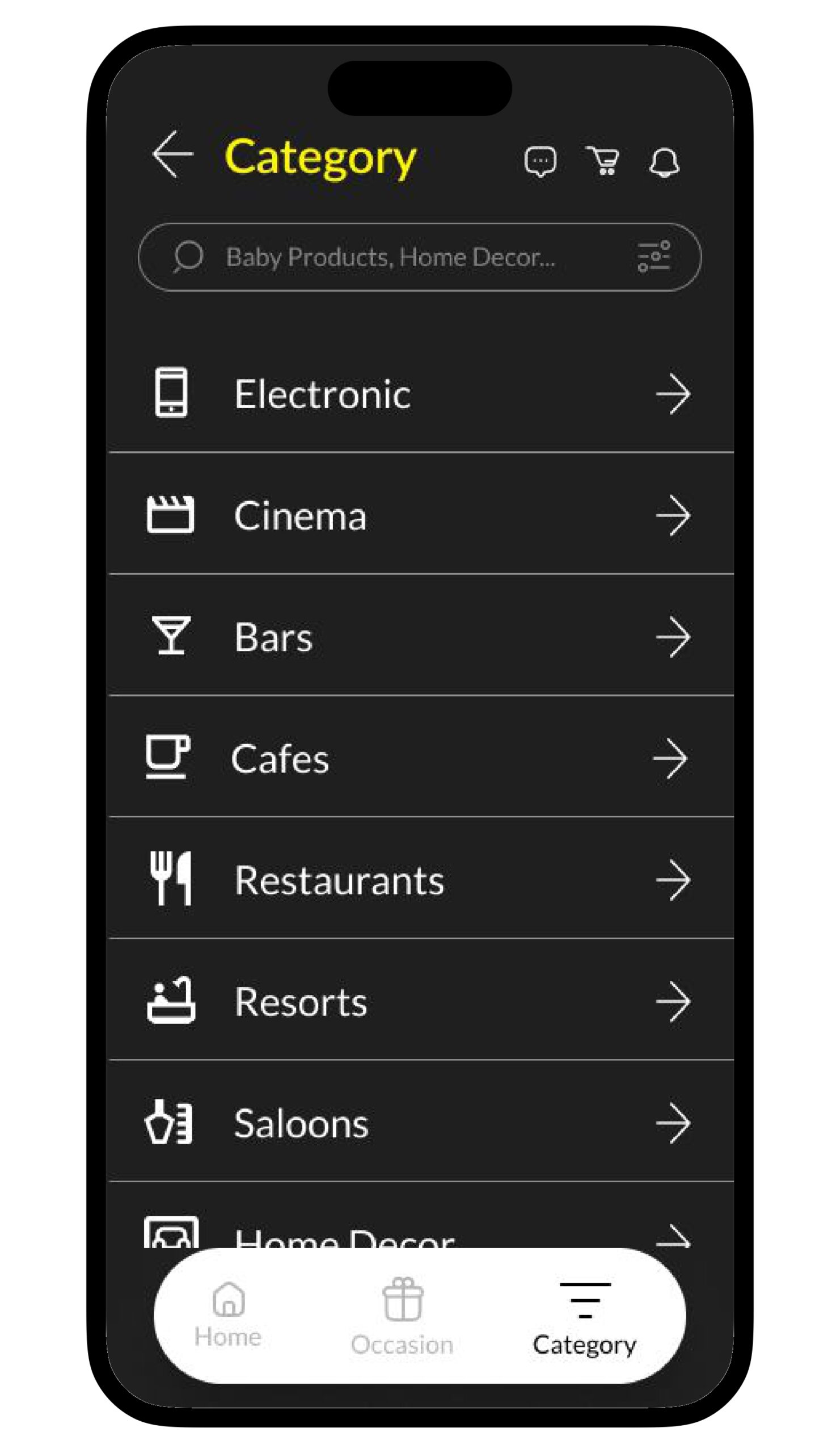 Within this domain, gifting vouchers are categorised for streamlined selection. For instance, opting for “electronics” filters all relevant brands under the “Gift Cart” section. Similar categorisation is applied to other categories such as fashion, cinema, and restaurants, ensuring efficient navigation and tailored gifting options for users.