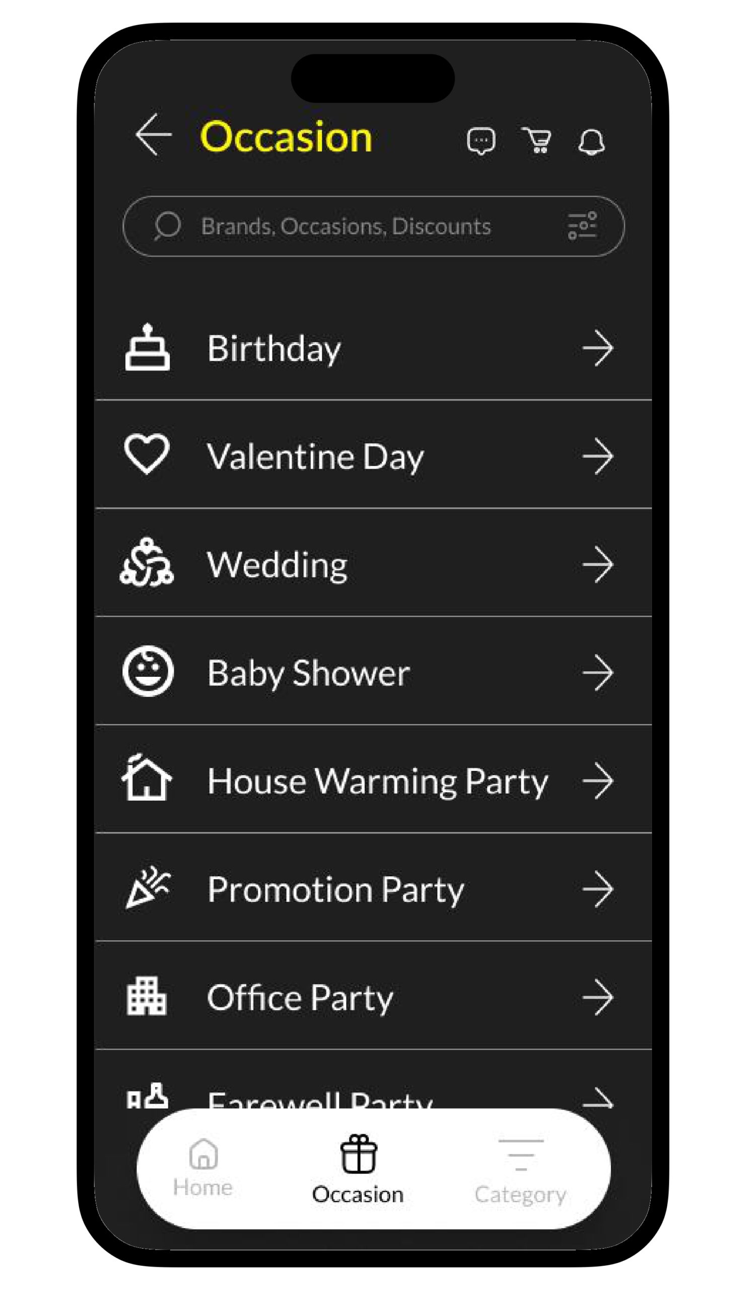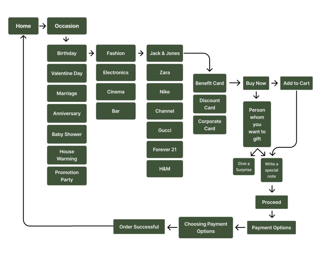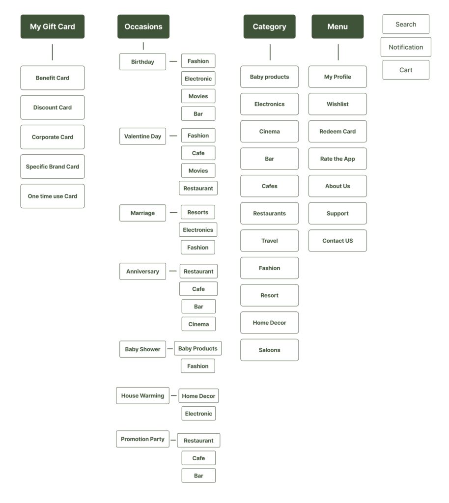 For instance, choosing “birthday” would navigate users to categories like fashion, electronics, and more, each containing respective brands within Gift Cart’s platform.