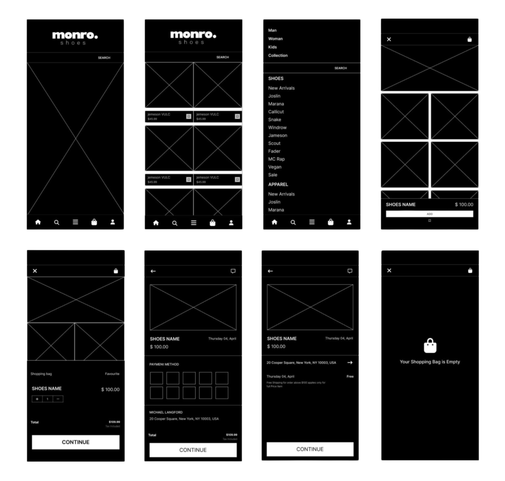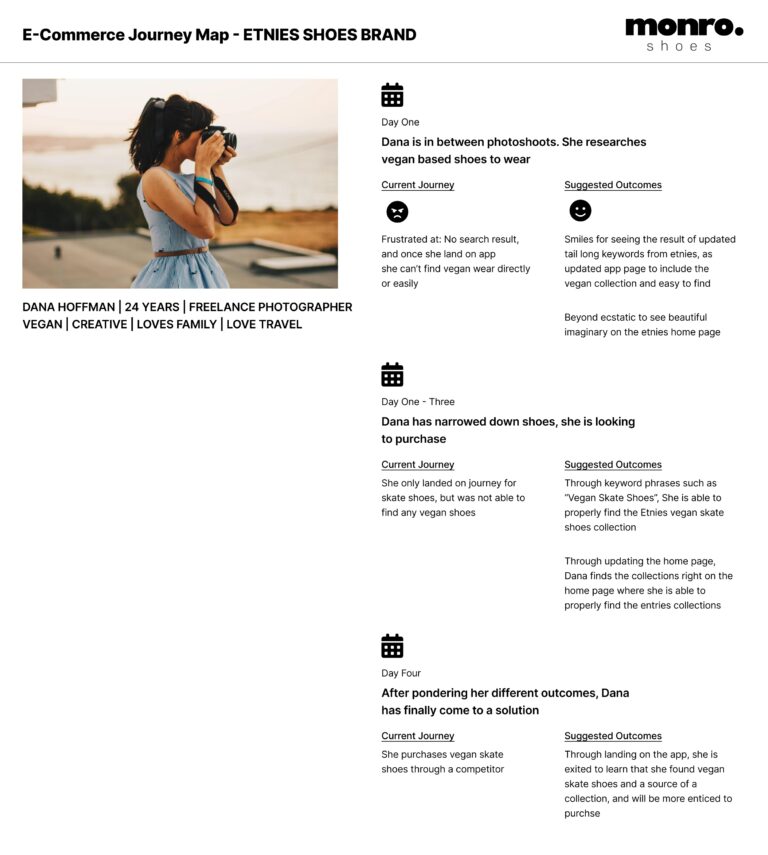 One of the many strengths that I discovered from monro is that it is a well-known skateboarding brand that has been around since 2002. They have a reputation for creating durable and stylish shoes. One of the apparent weaknesses of the site (when I researched) was that there were no evident incentives to be able to promote a customer to shop outside of standard free shipping with a minimum amount of purchase. The weaknesses presented mass opportunities on where to take the app. Pushing forward on incentives is critical to be able to drive sales. Examples of these opportunities are to present sale items and target specific consumers outside of the desired skateboarders or extreme athletes. Threats are apparent to monro through their competitors such as Vans, DC, Supra, Converse, and more. These competitors have also crossed over to everyday lifestyle shoes and apparel as well as mainstream media. monro seems to have a niche in the market of extreme athletic sportswear and should make more of an effort to crossover to obtain a broader consumer base.