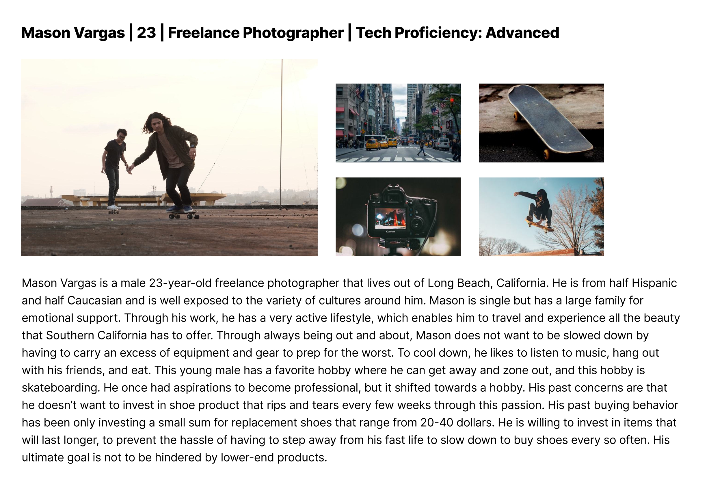 After the SWOT analysis, We conducted a competitor analysis. Direct competitors to the monro brand are known lifestyle brands such as DC Shoe Company and Vans Skate Company. Vans started as a skate shoe company and has been able to transition towards a mainstream audience and present itself as a lifestyle brand. Evidence of this can be shown with its collaborations with Disney, as well as its cross-nation tour in the Vans Warped Tour festivals. Other factors that help differentiate them is their personalized shoe creation service. By using this competitor analysis, I discovered that morno’ vegan line was one of the main differences that set them apart from their competition.